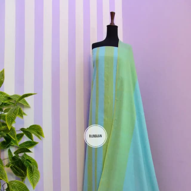 Hand woven organic cotton lehnga with silk yarn 5 yards. Jamawar blouse 2 yards. Golden organza dupata 2.75 yards. Delivery takes 8 to 14 days